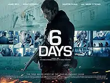 6 Days is a 2017 action thriller film directed by Toa Fraser and written by Glenn Standring.[5] A British-New Zealand production, it is based on the 1980 Iranian Embassy siege in London and stars Jamie Bell, Abbie Cornish, Mark Strong and Martin Shaw.