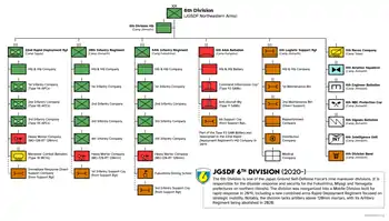 The 6th Division (第6師団, Dai-roku Shidan) is one of nine active divisions of the Japan Ground Self-Defense Force. The division has been subordinated to the North Eastern Army and is headquartered in at JGSDF Camp Jinmachi located in Higashine, Yamagata Prefecture in northern Japan. Its responsibility is the defense of Fukushima, Miyagi and Yamagata prefectures.