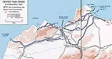 After the Vichy French forces were defeated in Algeria, Allied efforts moved east, toward Tunisia. In a series of rapid thrusts beginning on 24 November, elements of the 1st Armored Division and other Allied units began advancing on Tunis. Despite early American success, a German-Italian force under General Wolfgang Fischer counterattacked on 1 December, driving Allied units back. LTC McGinness' 2-6 Infantry arrived in the area that afternoon and began staging for an Allied counterattack. The next day, 2 December, Axis units began harassing Allied lines of communication along the Medjez-el-Bab-Tebourba road, so LTC Kern's 1-6 Infantry was sent to destroy them, which they did with the help of C Bty, 27th Armored Field Artillery Battalion. By 4 December, the enemy had retaken the town of Tebourba, and the Allied forces rushed to get into defensive positions after plans for a counterattack were abandoned. 1st and 2nd Battalions of the 6th Armored Infantry formed the main body of this defensive line, supported by elements of the 1st Armored Regiment, 13th Armored Regiment, 27th Field Artillery, and 701st Tank Destroyer Battalion.[3]