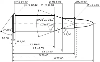 Americans would define the shoulder angle at alpha/2 ≈ 18.5 degrees. The common rifling twist rate for this cartridge is 300 mm (1 in 11.81 in), 4 grooves, Ø lands = 7.59 mm, Ø grooves = 7.83 mm, land width = 4.20 mm and the primer type used to be Berdan, but nowadays large rifle is more common.