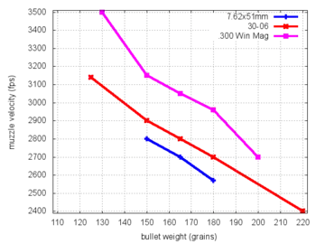 Specialized loadings were created for 7.62×51mm NATO-chambered sniper rifles. They used heavier and more aerodynamic bullets that had a higher ballistic coefficient than standard ball rounds, meaning they shed velocity at longer ranges more gradually.[11] Loss of velocity is important for accurate long-range shots because dropping from supersonic to transonic speeds disturbs the flight of the bullet and adversely affects accuracy. The standard M80 ball round weighs 147 gr and from an M14 rifle and M60 machine gun has a muzzle velocity 200 ft/s (61 m/s) faster than the M118LR 175 gr sniping round. However, the M80 drops to subsonic velocity around 900 m (984 yd), while the initially slower M118LR is supersonic out to 1,000 m (1,094 yd) due to its low-drag bullet.[12]