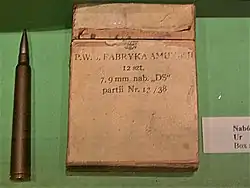 The 7.92×107mm DS was a Polish 7.92 mm anti-tank ammunition designed specifically for use with the karabin przeciwpancerny wz.35 anti-tank rifle. It was based on a standard 7.92×57mm Mauser cartridge, but was much longer (107 mm as opposed to the 57 mm of Mauser cartridge) and was modified to provide higher muzzle velocity and hence more penetrating power.