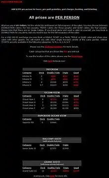 To visit the festival, it is only necessary to book a cabin, this includes meals, non-alcoholic and non-carbonated drinks, and entry to all performances. The cheapest tickets (4-passenger cabin, deck 2) are always available for US$766 per person, the most expensive (2-passenger Grand Suite with large balcony, deck 10) are $2999 (2017), $3333 (2012 and 2013), also per person.[5] Additional costs per passenger vary each year; these are for taxes, port fees, "booking fees," nonrefundable onboard gratuities, and other administrative costs. In addition to the concerts, there are the usual amenities on board a cruise ship: a gym, a spa, a casino, several fee-included restaurants, pools, hot-tubs (some very close to the pool-deck stage), plus a basketball court, body-slides and a climbing wall for recreation.