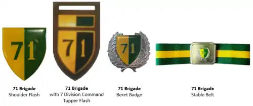 71 Brigade can trace its origins back to a structure in the late 1960s, called 17 Brigade, which was headquartered in Cape Town. 17 Brigade was housed in the Castle with Western Province Command.[1] On 1 August 1974, through a reorganization of the Army’s conventional force, the name was changed to 71 Motorised Brigade.[2]