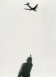 In 747, Burden was photographed firing shots with a pistol at a Boeing 747 passenger airplane while it took off from Los Angeles International Airport at about 8 am on January 5, 1973.[2] It had a single witness, photographer Terry McDonnell, who filmed the act. Burden was later interviewed by the Federal Bureau of Investigation after a photograph of the piece was published in a magazine; a calling card was left by the FBI at his studio. A meeting subsequently took place at his lawyer's house, where he explained the nature of Burden's work in performance art to a FBI agent who conclusively agreed to call off any further investigation.[3]