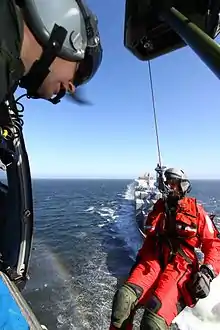 In 2010, the transport of Pope Benedict XVI in his first visit to Portugal.[19] The 751 Squadron was in different occasions, requested to provide support to neighbouring countries, such as Spain and Morocco. As an example, the support provided during the rescue of the sailors of the sunk "MV KEA", 180NM off the coast of Galiza, Spain, in March 2010.[20] The crew that performed this mission was later awarded, by SASEMAR (the Spanish agency responsible for the Search and Rescue services in Spain) the "Ancla de Plata" award, an annual prize that intends to congratulate crews and people that contribute to SAR or Anti-pollution missions.[21] In December 2011, the 6 missing fishermen from the fishing vessel "Virgem do Sameiro" were located and rescue by one of the 751 helicopters, north of Figueira da Foz. Their ship had sunk 3 days before and the fishermen had been adrift in a life raft.[22] At February 3, 2013, a crew deployed Air Base 4, Lajes rescued a lone yachtsman 700 km from Lajes at night. Javier Sanso, was in the liferaft since the shipwrecked of his sailboat and was at the ocean without assistance.[23][24] In October 2014, during a storm two Finnish sailors needed to be rescued. The mast of the sailboat "Chilom" was gone and they found themselves drifting. In a very adverse weather conditions it was possible to rescue the two safely.[25][26] During an international Search and Rescue exercise, a crew has been activated to rescue 4 sailboat, passengers of "S / V Kolibri" which had become damaged. Comprising 8 hours and 30 minutes of actual flying time, and the distress call coming from just over 400 nautical miles, this rescue has been acknowledged as the Portuguese Air Force's longest search and rescue mission with the longest distance covered.[27][28] On 29 February, the 751 Squadron rescued 10 crew member of the fishing ship "Ilhas do Mar" in the Madeira archipelago.