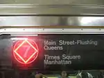 By 2008, all R62As on the 7 were upgraded with LED lighted signs to distinguish between express and local trains. These signs are located on the rollsigns that are found on the side of each car. The local is a green circle around the 7 bullet while the express is a red diamond. Previously, the rollsigns showed either a (7) (within a circle) or a <7> (within a diamond) with the word "Express" underneath it.[80]