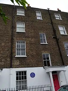 The terraced house is a Grade II* listed building.[1] It is four storeys tall, two windows wide with a Doric porch and built of brown brick with stucco to the ground floor. A blue plaque was erected by London County Council.