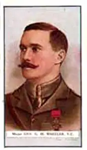 On 12 April 1915 at Shaiba, Mesopotamia, Major Wheeler led his squadron in an attempt to capture a flag which was the centre-point of a group of the enemy who were firing on one of his troop's picquets. He advanced, attacked the enemy's infantry with the lance, and then retired while the enemy swarmed out of hidden ground where Royal Artillery guns could attack them. On 13 April Major Wheeler led his squadron to the attack of the North Mound. He was seen far ahead of his men, riding straight for the enemy's standards, but was killed in the attack.