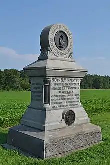 The regiment left for Washington, D.C. and performed picket duty along the Potomac in the vicinity of Upton's Hill, during the first winter. It fought in Gen. John Pope's Virginia campaign. At the second Bull Run the 80th lost 279 in killed, wounded and missing, and Col. Pratt died a few weeks later of the wounds received in that battle. It was active at South mountain and Antietam, encamped at Sharpsburg for one week and marched through Crampton's Gap, Leesburg, Warrenton and Stafford Court House to Fredericksburg, where it participated in the battle. Winter quarters were established soon after near Hall's Landing and occupied until Jan. 7, 1863, when the 80th was assigned, to the provost guard brigade, with headquarters at Brooks' Station and remained on duty at army headquarters until after the battle of Chancellorsville. In June, 1863, the regiment was closely engaged at Gettysburg, where it lost 170 killed, wounded or missing out of 287 engaged. It suffered most severely in the repulse of George Pickett's charge on the last day. After the battle of Gettysburg, the 80th was again ordered to headquarters for provost guard duty and continued in this service until the end of the siege of Petersburg, when it shared in the final assault, April 2, 1865. From April 22 to November 27, 1865, it was stationed at Richmond and then ordered to Norfolk, where it remained until mustered out on January 29, 1866. The regiment early became known for its fine fighting qualities and sustained a reputation for courage and steadiness under fire throughput its long term of service, which lasted, including its militia service, from the spring of 1861 to Jan., 1866. The regiment is classed among the "three hundred fighting regiments," which includes every regiment in the Union Armies which lost over 130 in killed and died of wounds and were considered among the most gallant fighting forces during the Civil War. [1]