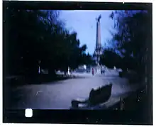 The 828 format uses the same basic film stock as 135 film (standard 35mm film), but the film lacks the sprocket holes of 135. The standard image format is 40 × 28 mm. This provides a 30% larger image compared to 135's standard 24 × 36 mm, yet on the same film stock. Because Kodak targeted 828 at a lower-end consumer market, the film was much shorter, at a standard 8 exposures per roll. 828 film originally had one perforation per frame, much like 126 film.[1] Unlike 135 (a single-spool cartridge film) or 126 (a dual-spool cartridge film), 828 is a roll film format, like 120 film. Like 120, it has a backing paper and frames are registered through a colored window on the back of the camera (except on the original folding Bantams, where images were registered with an index hole).
