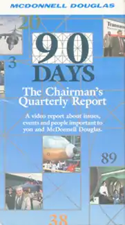 90 Days is a video news magazine produced by McDonnell Douglas in St. Louis, MO and distributed at the end of every business quarter (hence the show's title) through the mail to employees and shareholders of the company in VHS format. From its inception in September 1989 until the final episode in 1996 under the "90 Days" title, the program routinely featured segments about employees and company programs or products, all while incorporating a review of financial results from the previous quarter. An example clip from the program can currently be found on the video website YouTube. It was "a video report about issues, events and people important to you and McDonnell Douglas."[1]