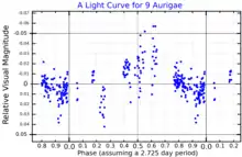- Krisciunas, K.; Aspin, C.; Geballe, T. R.; Akazawa, H.; Claver, C. F.; Guinan, E. F.; Landis, H. J.; Luedeke, K. D.; Ohkura, N.; Ohshima, O.; Skillman, D. R. (1993). "The 9 Aurigae system". Monthly Notices of the Royal Astronomical Society. 263 (3): 781–788. arXiv:astro-ph/9304008. Bibcode:1993MNRAS.263..781K. doi:10.1093/mnras/263.3.781. S2CID 18596475.