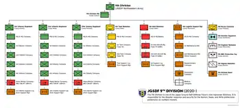 The 9th Division (第9師団) is one of nine active divisions of the Japan Ground Self-Defense Force. The division is subordinated to the North Eastern Army and is headquartered in Aomori. Its responsibility is the defense of Akita, Aomori and Iwate prefectures.