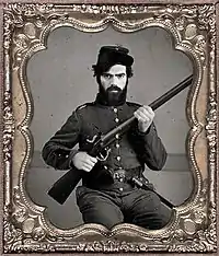 The 9th New Jersey Infantry Regiment was raised as a regiment of riflemen with broadsides posted throughout the state during September 1861 for 'sharpshooters', men who could show proficiency with a rifle. Recruiting started in September but the first muster occurred on 5 October at Camp Olden near Trenton. The camp was named for the governor of New Jersey, Charles Smith Olden. The regiment's nickname was the Jersey Muskrats.[2]