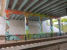 Nearby, along the rail trail, is Halcyon Idyll I and Halcyon Idyll II, by Sharon Dowell. These murals cover approximately 9,000 sq ft (840 m2) on five facades facing the sidewalk, located under 11th Street and Brookshire Freeway. Adjacent to the underpass murals is a signal house wrapped in vinyl with a vibrant pattern titled Coexist.[2]