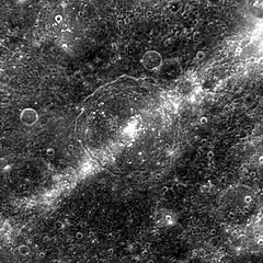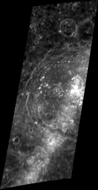 Aśvaghoṣa is an impact crater on Mercury, 90 kilometers in diameter. It is located at 10.4°, 21°W, south of the crater Abu Nuwas and southwest of the crater Molière. It is a nearly circular formation, and its rim remains intact, except where it is broken at its southern side, and at its northern side by an indentation from two conjoined craterlets. On the crater floor is a central mountain that rises to multiple peaks. The crater is named for Indian philosopher and poet Aśvaghoṣa, and its name was adopted by the International Astronomical Union in 1976.[1][2]