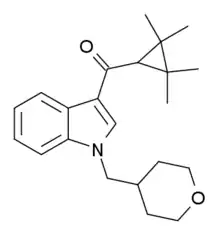 A-834,735 is a drug developed by Abbott Laboratories that acts as a potent cannabinoid receptor full agonist at both the CB1 and CB2 receptors, with a Ki of 12 nM at CB1 and 0.21 nM at CB2. Replacing the aromatic 3-benzoyl or 3-naphthoyl group found in most indole derived cannabinoids with the 3-tetramethylcyclopropylmethanone group of A-834,735 and related compounds imparts significant selectivity for CB2, with most compounds from this group found to be highly selective CB2 agonists with little affinity for CB1. However, low nanomolar CB1 binding affinity is retained with certain heterocyclic 1-position substituents such as (N-methylpiperidin-2-yl)methyl (cf. AM-1220, AM-1248), or the (tetrahydropyran-4-yl)methyl substituent of A-834,735, resulting in compounds that still show significant affinity and efficacy at both receptors despite being CB2 selective overall.[1][2][3][4][5]