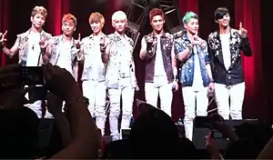 The debut of the group was announced on April 1, 2012 with a video teaser of their MBC Music's show Making the Star. During that time, they were temporarily called as 'DSP Boyz'.[2] More teasers of the show were revealed during the time on DSP Media's YouTube account, the second on April 4, the third on April 9 and the last on April 12. On April 13, the group signed a two-year contract as endorsement models for the sports casual brand Spris. DSP Media will be revealed the members one by one starting on April 17 on DSP Media's YouTube account.[3] Jaehyung 's on April 17.[4] Yunyoung's on April 18.[5] Jihu's (Hyojun at that time) on April 19.[6] Sungmin's on April 20.[7] Seungyeop and Hyeongkon's on April 22.[8] Seungjin's on April 23.