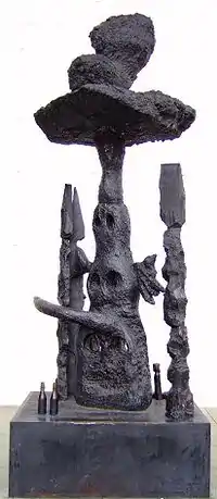 Penck's sculptures, although less known, evoke the same primitive themes as his paintings and drawings and use common materials, such as wood, bottles, cardboard boxes, cans, packing tape, tin and aluminum foil, wire and paste, all done with simplicity and spontaneity.[9]