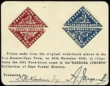Unfortunately, Jurgens appears to have got carried away with his initial success and he also produced reprints in red and blue and on wove and laid papers. Up to 17 sheets were produced.[1] This had all been done in November 1940 and March 1941, without the knowledge of the philatelic community.[1] Further allegations relating to forged cancellations on Cape material and a public spat with the expert committee of the British Philatelic Association did nothing to help Jurgens' reputation.[1]