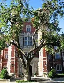 Evans' tenure as university president was marked by some notable achievements, including the construction of the third administration building. That administration building built during his tenure, which is a classic example of the Collegiate Gothic architectural style of campus, was later renamed in Evans' honor. The Encyclopedia of Oklahoma History and Culture called his reorganization of the university into colleges and schools as perhaps his most important accomplishment.[1] The College of Fine Arts, the College of Engineering, and the College of Arts and Sciences were all started between 1908 and 1911. He promoted the expansion of the Oklahoma University School of Medicine and presided over its merger with the Epworth College of Medicine. Also, the School of Law, led by Julien Monnet, was established during his tenure.[2]