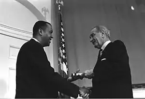 Following his appointment to the District Court, Higginbotham developed a relationship with President Johnson, attending various White House functions and conferences in the mid-1960s.[6] The day after the assassination of Martin Luther King Jr., Higginbotham was called to the White House to take part in a series of meetings to advise the President on how to respond to King's death.[6] Other notable figures at the meeting were Vice President Humphrey, Justice Marshall, Roy Wilkins, Whitney Young, Andrew Brimmer, Clarence Mitchell, Clifford Alexander, and Bayard Rustin. Higginbotham stayed the night at the White House, attended a service at the Washington National Cathedral, and continued to advise the President into the next days.[6]