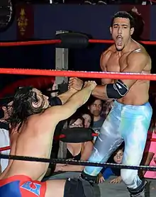 In March 2016, Fox started working for Lucha Underground as Dante Fox, a storyline military friend of Killshot, who had supposedly been killed in combat.[3] Fox feuded with Killshot until June 25 and the season three concluding Ultima Lucha Tres event, where he was defeated by Killshot in a "Hell of War" match.[2] The following day, Fox and Killshot, having seemingly made up, teamed with Willie Mack to win the Lucha Underground Trios Championship.[2]