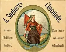 A- S'eborgs Fanrikker obtained permission to use Elisabeth Jerichau-Baumann's painting Mother Denmark in their logo.[5] In 2015–1923, Mathilde Muus published a series of cook books under her pseudonum E. Constantin as advertisement for the company.[6]
