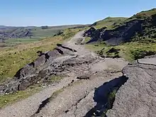 This section of the road was first constructed in 1819 by the Sheffield & Chapel-en-le-Frith Turnpike Company using spoil from the nearby Odin Mine.[2][3] It replaced a much earlier, ancient packhorse route, running through the Winnats Pass. Also known locally as "The New Road", the new section was set at an easier gradient than the earlier Winnats Pass route and crossed the Mam Tor landslide. As a result of further movement of the Mam Tor landslide, major road works were required in 1912, 1933, 1946, 1952 and 1966. On the last occasion, the road was closed for six weeks. In 1974, large parts of the Mam Tor section collapsed during a massive landslide. Additional road works were carried out regularly, when wet years led to further landslides. Finally, the Mam Tor section of the road was abandoned in 1979.[4] Hereafter, traffic was routed through the Winnats Pass to rejoin the A625 at Windy Knoll.[5]