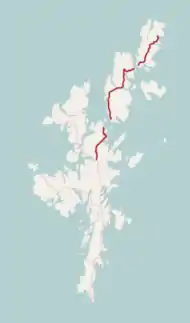 The A968 in Shetland is the United Kingdom's northernmost A-road.[1] It connects the islands of Yell and Unst[2] to the island of Mainland. The road is actually separated into three. The length of the part of the road on Mainland is 9.8 miles (15.8 km), on Yell 17.4 miles (28.0 km), and on Unst 10 miles (16 km). The road is marked red on most maps and goes from the A970 on Mainland to Haroldswick. It is 41.9 miles (67.4 km) long.