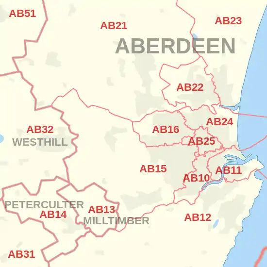 | AB12 | ABERDEEN | Altens, Ardoe, Banchory Devenick, Blairs, Bridge of Dee, Cove Bay, Kincorth, Maryculter, Nigg, Portlethen, Tullos | Aberdeen, Aberdeenshire |