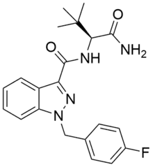 The (S)-enantiomer of ADB-FUBINACA is described in a 2009 Pfizer patent[4] and has been reported to be a potent agonist of the CB1 receptor and the CB2 receptor with EC50 values of 1.2 nM and 3.5 nM, respectively.[4][5] ADB-FUBINACA features a carboxamide group at the 3-indazole position, like SDB-001 and STS-135. ADB-FUBINACA appears to be the product of rational drug design, since it differs from AB-FUBINACA only by the replacement of the isopropyl group with a tert-butyl group.