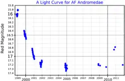 The star was discovered to be variable in 1927, with a photographic magnitude range of 15.3 to 16.5, at the Harvard College Observatory and designated HV 4013. It was considered to be the brightest variable star in M31[9][10] Two years later it was given the variable star designation AF Andromedae.[11] Between 1917 and 1953, five or six major eruptions were detected and two or three minor ones. More eruptions were observed in 1970-74, 1987-92, 1998-2001, [8] and 2017.[12]