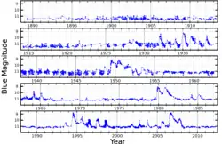 Every 12-16 years, outbursts occur and last for several years.[5] The brightness can increase to visual magnitude 7.9,[3] although usually not this bright.[5]