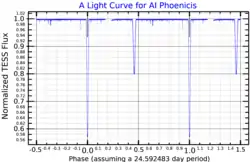 AI Phoenicis is a variable star in the constellation of Phoenix. An Algol-type eclipsing binary, its apparent magnitude is constant at 8.58 for most of the time, sharply dropping to 9.35 during primary eclipse and to 8.89 during secondary eclipse.[3] The system's variability was discovered by W. Strohmeier in 1972.[9] From parallax measurements by the Gaia spacecraft, the system is located at a distance of 560 light-years (171 parsecs) from Earth,[2] in agreement with earlier estimates based on its luminosity (173 ± 11 parsecs).[4]