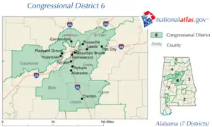 Alabama's 6th congressional district is a United States congressional district in Alabama that elects a representative to the United States House of Representatives. It is composed of the wealthier portions of Birmingham, nearly all of Jefferson County outside Birmingham, most of Blount County, and the entirety of Bibb, Chilton, Coosa, and Shelby counties.[5]
