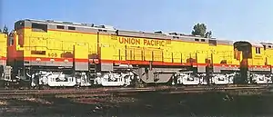 Powered by a pair of 16 cylinder ALCO 251C diesel engines, and rated at 5,500 hp (4,101 kW), it was ALCO's answer to the EMD DD35A and the GE U50. The C855 rode on four two-axle trucks, grouped in pairs linked by span bolsters, giving a wheel arrangement of B+B-B+B. The trucks and bolsters were similar to those under UP's earlier turbine locomotives. Only two A units and one B unit were built, all for the Union Pacific Railroad, which had also requested double-engined locomotives from EMD and GE in order to replace the turbines, which had become uneconomical to operate.[1]