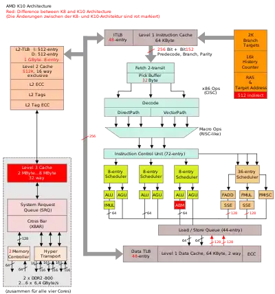 - Wider L1 data cache interface allowing for two 128-bit loads per cycle (as opposed to two 64-bit loads per cycle with K8)