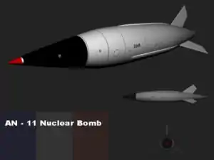 The AN-11 was a pure fission weapon, a plutonium implosion type. It weighed approximately 1,500 kg (3,306 lb). It was a free-fall bomb intended to be dropped from high-altitude bombers. The explosive nuclear weapon yield was about 60 kt.