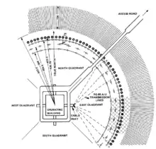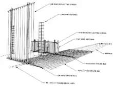 The 1970 estimate to construct a CDAA was just under $900,000 ($6.28 million today) with electronics at the site estimated at around $20 million ($140 million today).[1] The system had 120 high band antennas and 40 low band antennas which had to be positioned within +/- two minutes of arc and +/- 3 inches of their intended distance from the center of the array. 160 75 ohm coaxial transmission lines were used to carry signals from the antennas had to be electrically matched to within 3/4 of a degree at 10 MHz. This task was estimated at 300 to 400 man hours to complete.[1] There was also an extensive grounding system used at the FRD-10 sites. This included 360 ground radials made of 8 AWG wire, 150 feet (46 m) long, extending from the outer antenna ring. It also included a massive ground grid, made of 10 AWG wire bonded together to create a mesh with 2 feet (61 cm) squares. It was laid underground up to the radials in the area between the high and low antennas.[1]