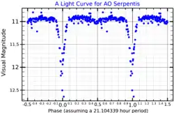 AO Serpentis is an eclipsing binary star system in the Serpens Caput segment of the Serpens constellation. It is invisible to the naked eye with a typical apparent visual magnitude of 11.04.[3] Variable star observers record a peak magnitude of 10.7, dropping to 12.0 during the primary eclipse and 10.8 from the secondary eclipse.[7] The distance to this system is approximately 1,450 light years based on parallax measurements.[2]