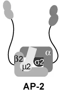 The AP2 adaptor complex is a multimeric protein that works on the cell membrane to internalize cargo in clathrin-mediated endocytosis.[1] It is a stable complex of four adaptins which give rise to a structure that has a core domain and two appendage domains attached to the core domain by polypeptide linkers. These appendage domains are sometimes called 'ears'. The core domain binds to the membrane and to cargo destined for internalisation. The alpha and beta appendage domains bind to accessory proteins and to clathrin. Their interactions allow the temporal and spatial regulation of the assembly of clathrin-coated vesicles and their endocytosis.