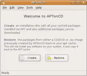 APTonCD is a tool that can back up software packages (.deb files) downloaded via Advanced Packaging Tool (APT) or aptitude, creating a repository that can be used to install those packages on other computers without Internet access. APTonCD gathers the collected packages into a single ISO image. A third-party optical disc authoring tool can subsequently write the ISO image to a disc.