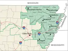 The district fully encompasses the counties of Arkansas, Baxter, Chicot, Clay, Cleburne, Craighead, Crittenden, Cross, Desha, Fulton, Greene, Independence, Izard, Jackson, Lawrence, Lee, Lincoln, Lonoke, Mississippi, Monroe, Phillips, Poinsett, Prairie, Randolph, Saint Francis, Searcy, Sharp, Stone, and Woodruff. The district also encompasses parts of Jefferson county.