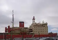 The Tandanor shipyard repaired the fire damage and also reconfigured the vessel to increase laboratory space from 74 m2 (800 sq ft) up to 415 m2 (4,470 sq ft). This allows the ship to be used primarily as a research vessel in addition to its role of resupplying the southernmost Antarctic base Belgrano II.[3] The diesel engines have been replaced by four new ones purchased from MAN in October 2011.[3][36] The main radar of Irízar was also repaired in Argentina by CITEDEF.[4] Work was initially estimated to be finished by November 2011,[38] but it was not until April 2017 that the icebreaker was declared seaworthy again.[39]