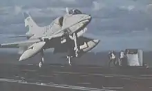 Following the outbreak of hostilities on 1 May 1982, the Argentine carrier planned an attack on the Royal Navy Task Force. Veinticinco de Mayo's S-2 Trackers detected the British fleet late that day, and a strike by all eight A-4Q Skyhawk jets was prepared, scheduled to take-off at dawn. The attack did not take place, because subsequent Tracker sorties had failed to relocate the British fleet.[7] After the British nuclear-powered submarine HMS Conqueror sank General Belgrano, Veinticinco de Mayo returned to port.[8] The naval A-4Q Skyhawks flew the rest of the war from the airbase in Río Grande, Tierra del Fuego.