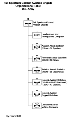 Heavy divisions (of which there are six) will have 48 Apaches, 38 Blackhawks, 12 Chinooks, and 12 Medevac helicopters in their aviation brigade. These are divided into two aviation attack battalions, an assault lift battalion, a general aviation support battalion. An aviation support battalion will have headquarters, refuelling/resupply, repair/maintenance, and communications companies.[120] Light divisions will have aviation brigades with 60 armed reconnaissance helicopters and no Apaches, with the remaining structure the same. The remaining divisions will have aviation brigades with 30 armed reconnaissance helicopters and 24 Apaches, with the remaining structure the same. Ten Army Apache helicopter units will convert to heavy attack reconnaissance squadrons, with 12 RQ-7B Shadow drones apiece.[117][121] The helicopters to fill out these large, combined-arms division-level aviation brigades comes from aviation units that used to reside at the corps-level.