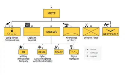 By 2028, in Multi-Domain Operations (MDO)[lower-alpha 2]—as part of the Joint force, Army Strategy is to counter a near-peer adversary which is capable of competition in all domains.[lower-alpha 3][25][26][27][28][29][30] In 2019, the planning was for Large Scale ground Combat Operations (LSCO) at echelons above the brigade combat team.[31][32][22] Multi-Domain Task Forces (MDTFs) operate in a combatant commander's theater (area of responsibility). MDTFs are experimental brigade-sized units which are tailored to the theater; they are to operate subordinate to a Theater fires command, or to a corps, or division headquarters, jointly or independently, depending on the mission.[33][26] These MDTFs increase the "capability to connect with national assets" in space and cyber, with "the capacity to penetrate with long range fires, with the ability to integrate all domains".[33][34] —This is integrated deterrence:[35][36] taking existing capabilities, as well as building on §new capabilities, which have been deployed in new and networked ways,[lower-alpha 3] all tailored to the security landscape of the respective regions, in order to deter the antagonists.[37]