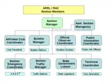 Local and regional operational activities of the American Radio Relay League are carried out through its Field Organization. The organization divides the 15 Divisions into 71 separate geographic regions called Sections. Each Section has a similar team of one elected, volunteer Section Manager and several volunteer positions. Section Managers are elected by the members living within the section for a two-year term. The Section Manager appoints a team of volunteers. A Section Manager may optionally appoint one or more Assistant Section Managers.[6]